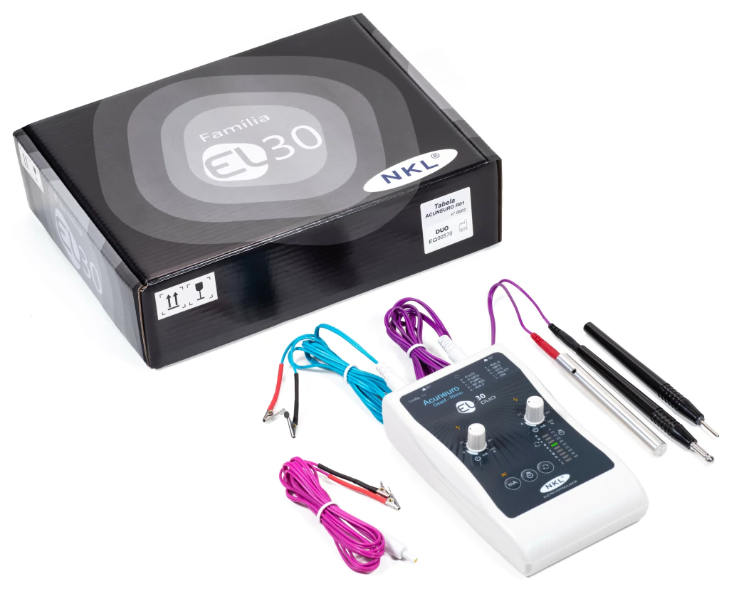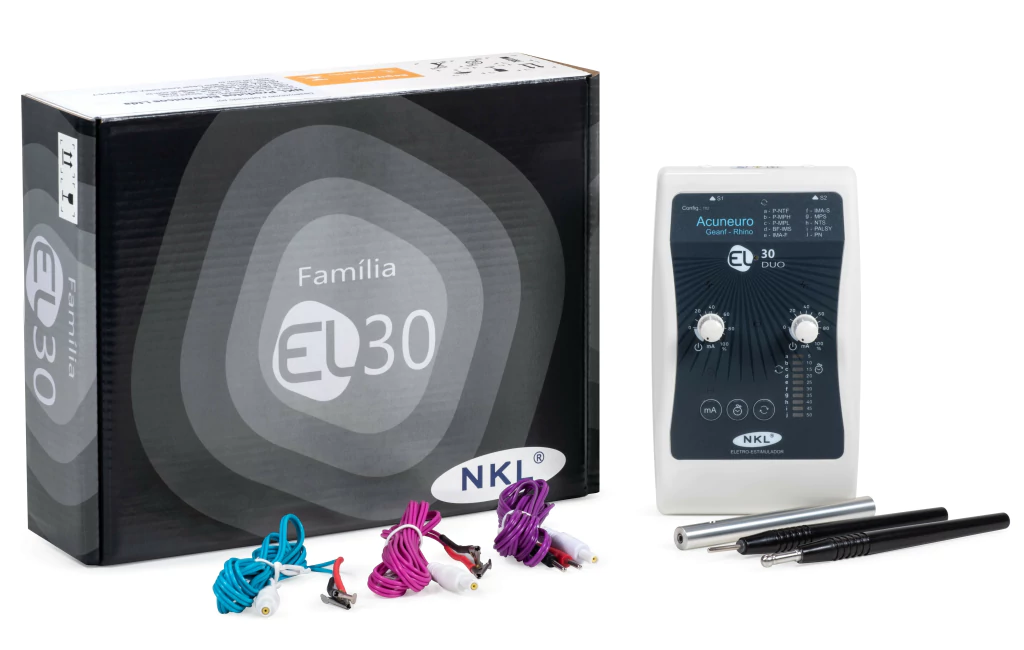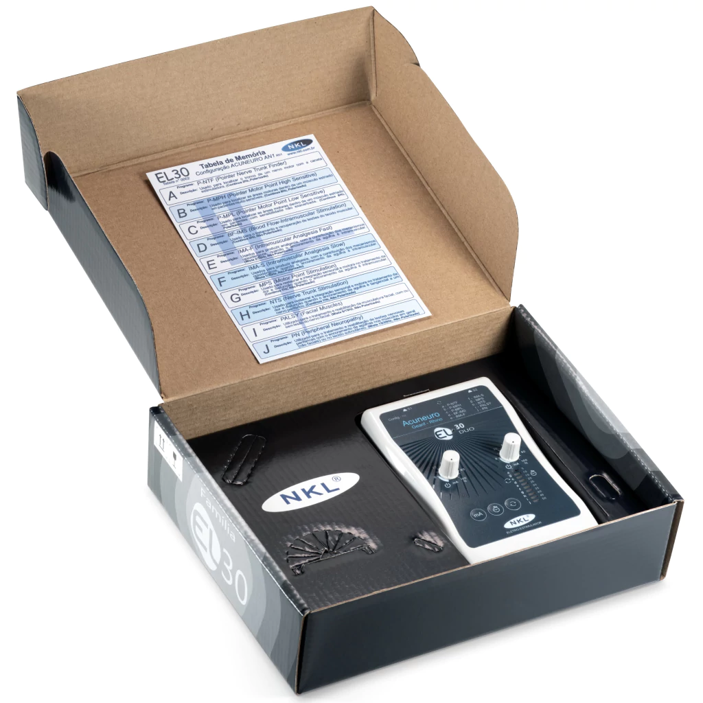 O EL30 Duo Acuneuro é um eletroestimulador com 2 canais de estimulação com controles de potência independentes. Conta com programas fixos de estimulação alojados na memória que podem ser facilmente selecionados pelo usuário.