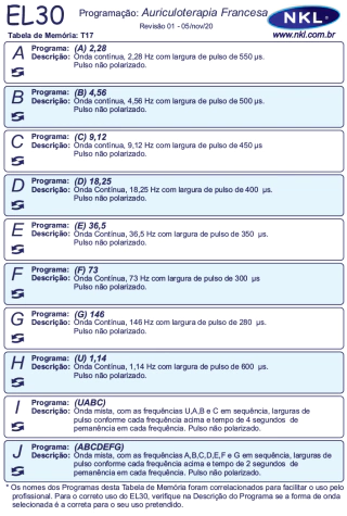 Este equipamento é destinado ao uso por profissionais da área da saúde, antes de adquirir é necessário ter conhecimento sobre a técnica de eletroestimulação e a aplicação das frequências disponíveis na memória do equipamento escolhido. A NKL não fornece indicações de tratamentos, as mesmas devem ser adquiridas em cursos e graduações na área.