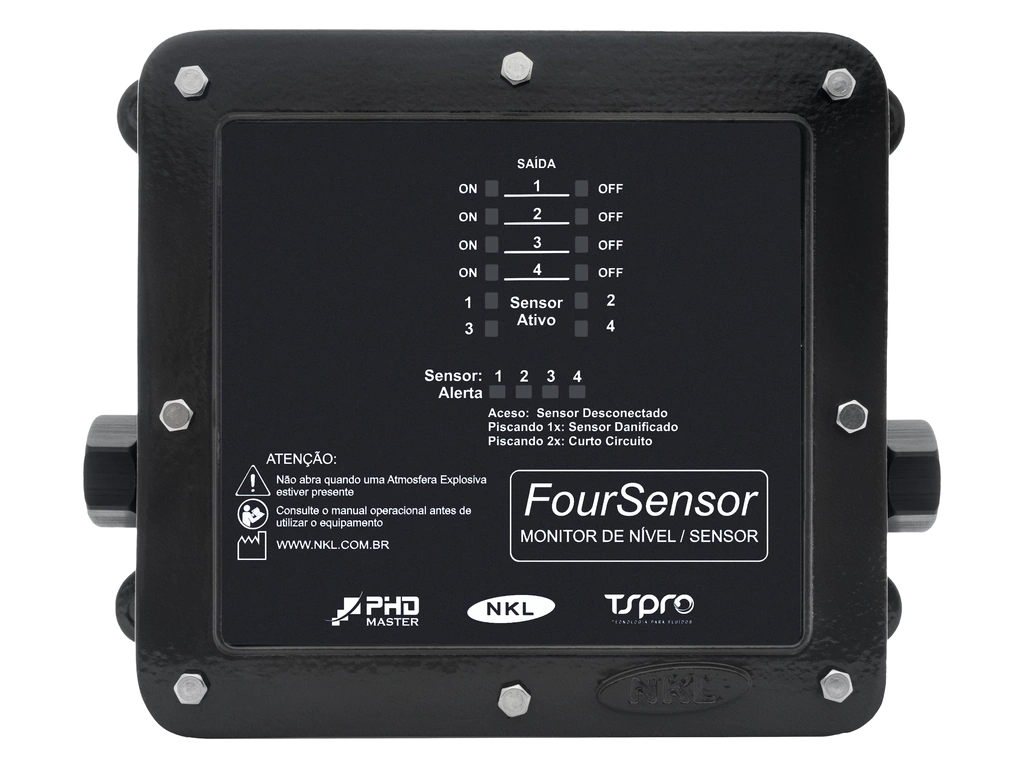 Ele é capaz de avaliar o status simultâneo de até 4 sensores de presença de líquido do tipo óptico NKL (padrão 2 fios) ou até 4 sensores do tipo indutivo Namur, que podem ou não estarem instalados em área classificada.
